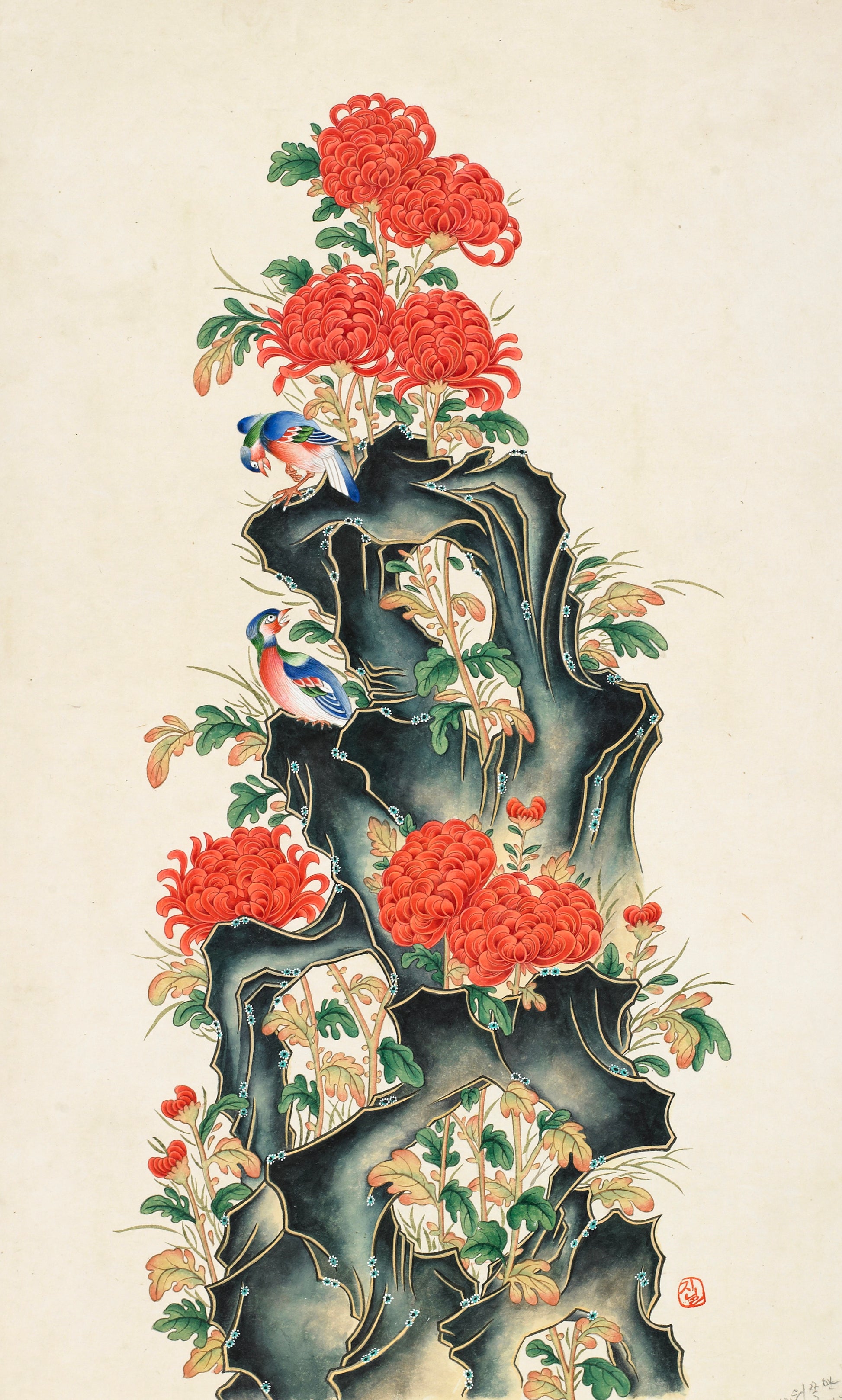 국화는 가을을 상징하며, 고결함과 절개를 의미합니다. 특히 추위를 견디는 국화의 특성은 군자의 품격을 상징하기도 합니다 이러한 그림은 단순한 장식적 목적을 넘어 장수, 행복, 자연과의 조화 등 여러 상징적 의미를 담고 있습니다