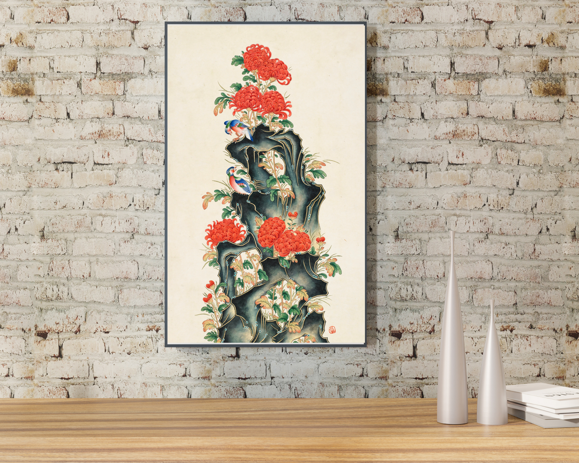 Chrysanthemums symbolize autumn and represent nobility and integrity. The chrysanthemum's ability to withstand cold weather particularly symbolizes the character of a virtuous person(Gun-Ja). These paintings go beyond mere decorative purposes, embodying various symbolic meanings such as longevity, happiness, and harmony with nature.professionally framed/mounted artwork