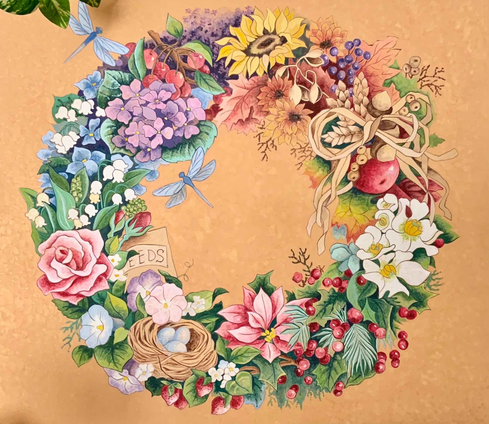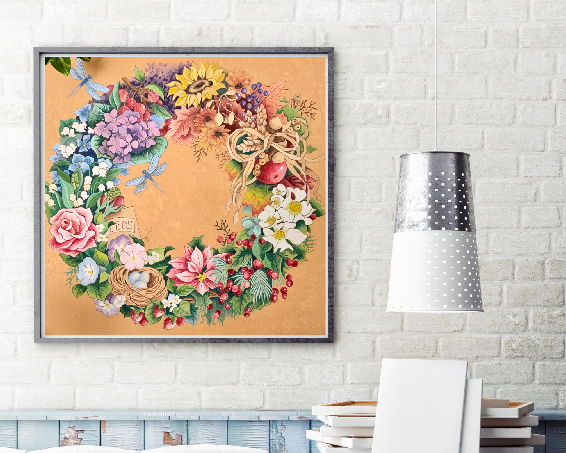 "It's a painting of a finished wreath on wood paneling - the kind of artwork that would complement any space where you hang it."
