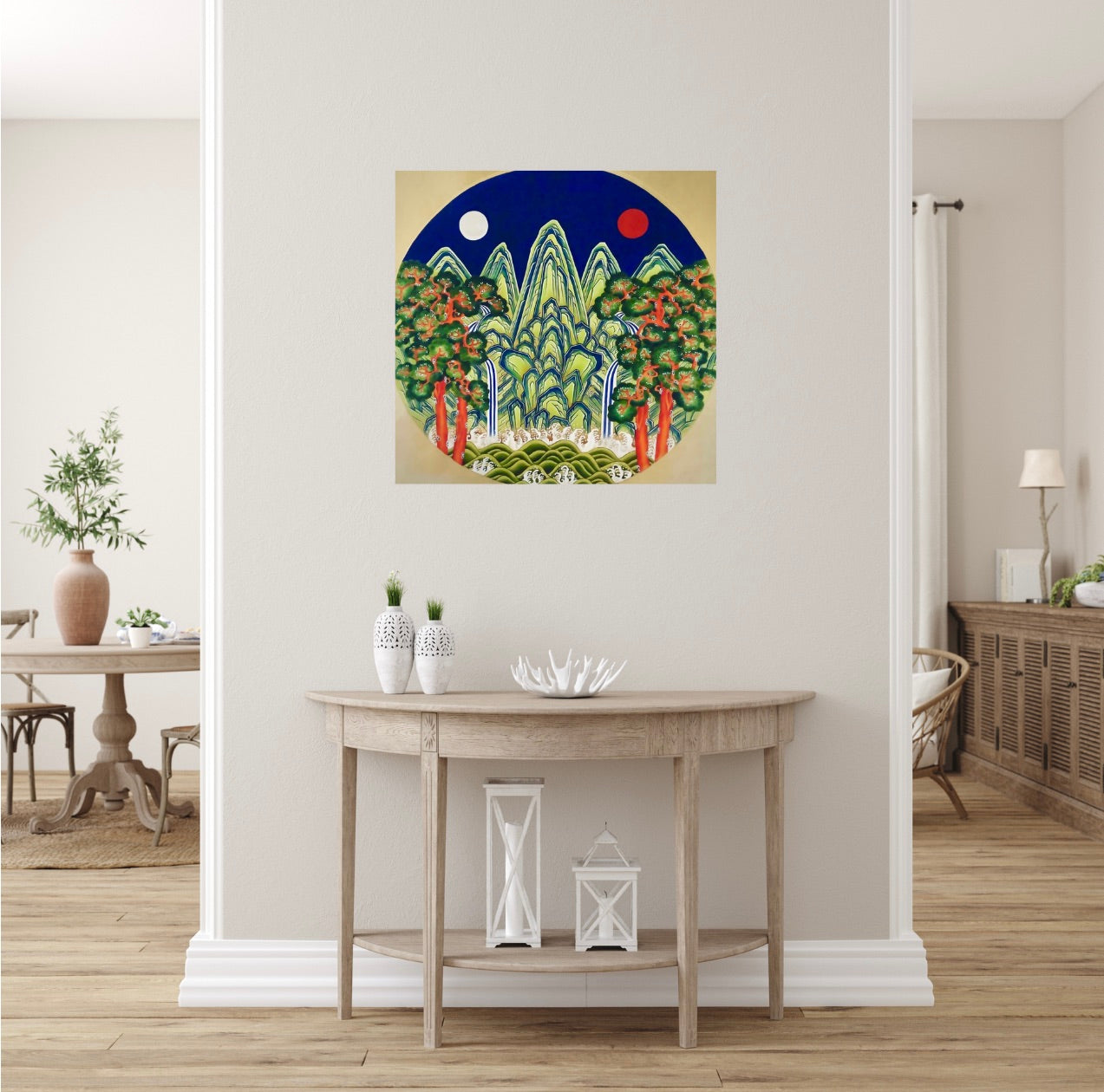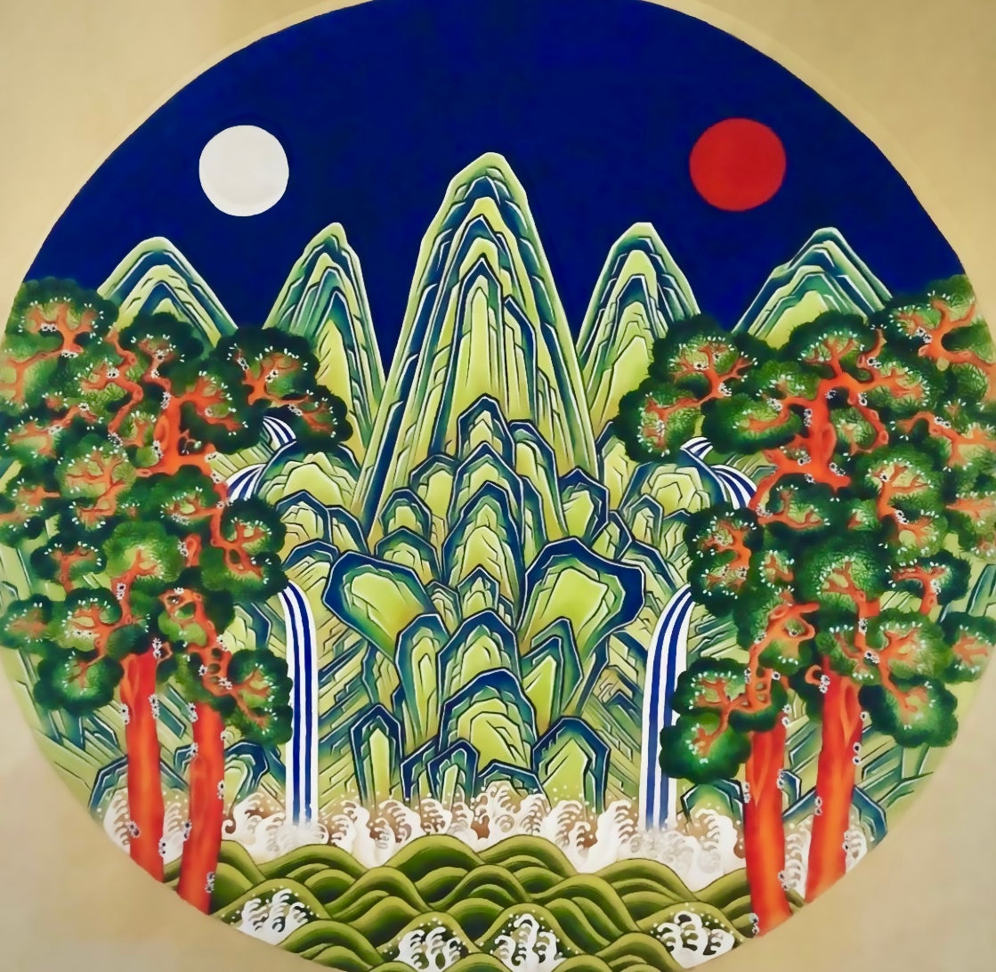 "This painting symbolizes royal authority and national stability. The five peaks represent the five elements (wood, fire, earth, metal, and water), while the sun and moon signify the harmony of yin and yang.It is a representative symbolic image of Korea that visually expresses national unity and the legitimacy of royal authority."