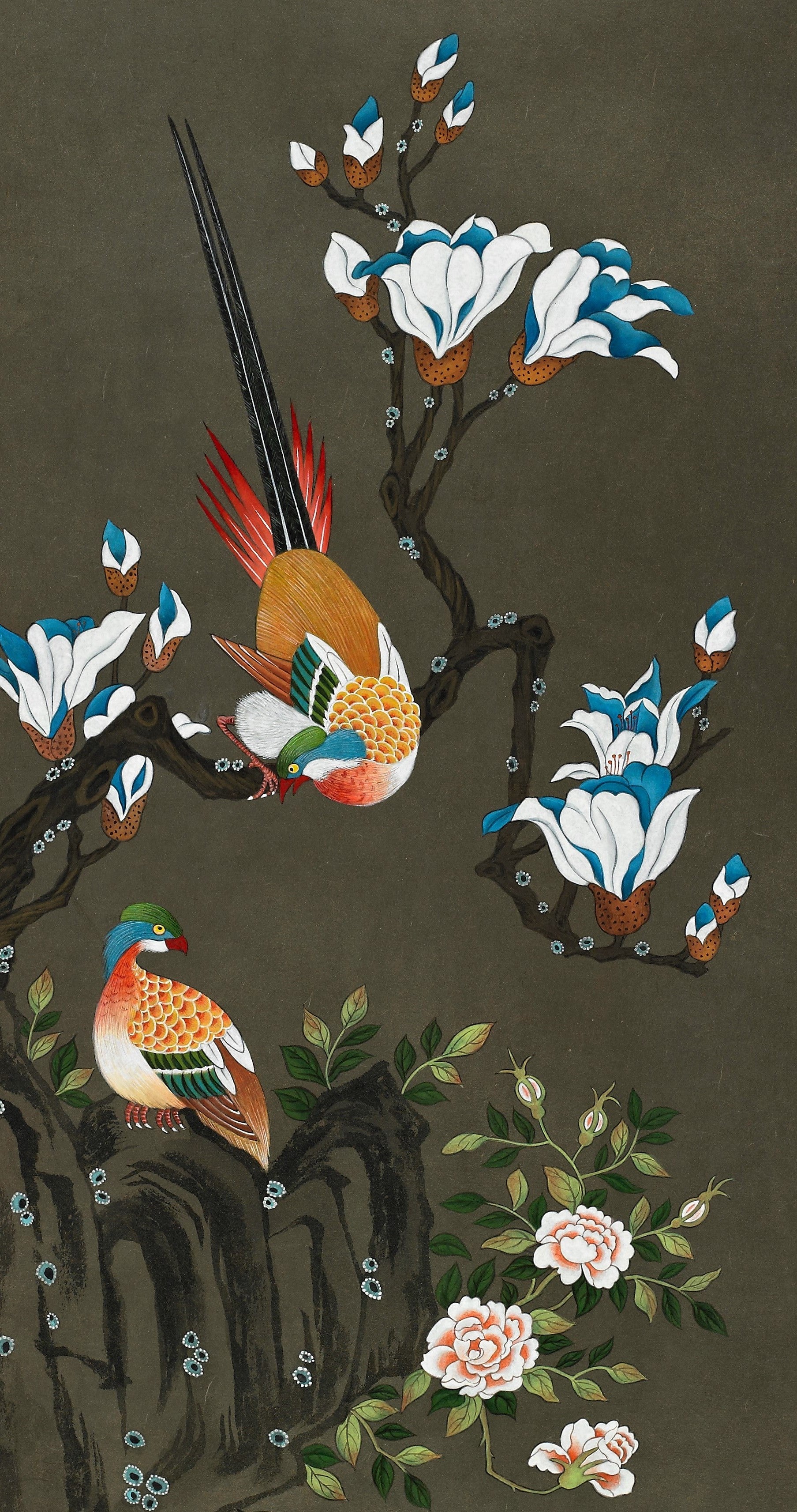 A harmonious painting depicting a pair of birds representing conjugal bliss together with flowers that symbolize wealth, prosperity, and worldly success.