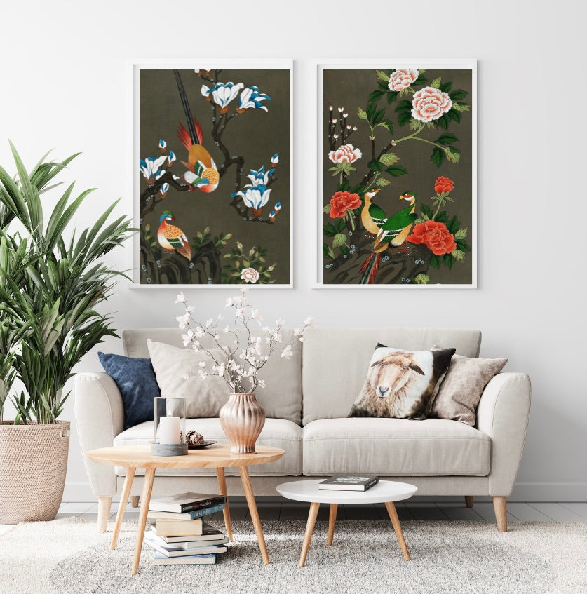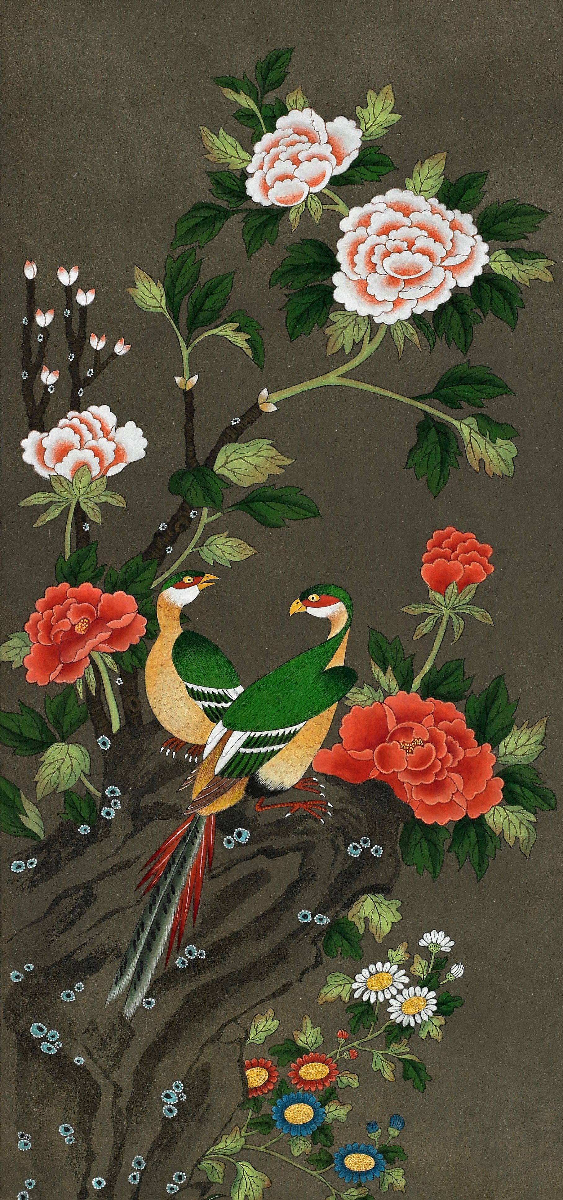 서로 금슬좋은 새 한쌍과 부귀영화의 의미를 지닌 꽃들을 조화롭게 그린 그림