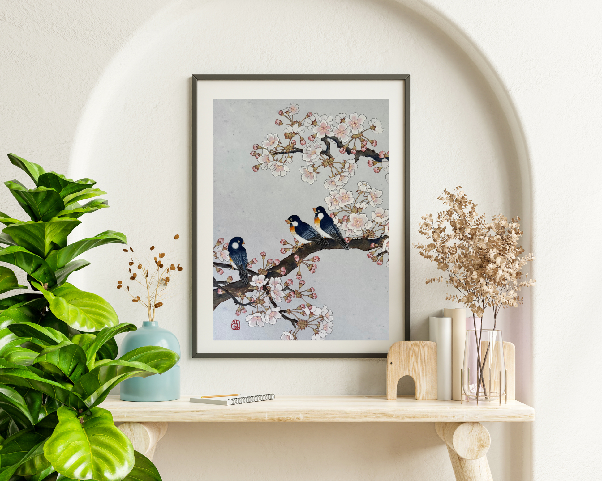 Artwork framed and mounted on wooden panel, actual dimensions 12" x 16"